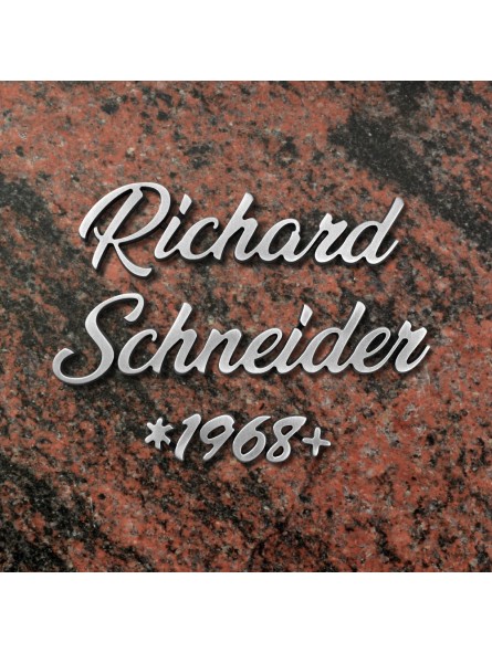 Hochwertige Metall-Schriftzeichen aus Aluminiumguss für Ihre Inschrift. Diese Schriftzeichen sind absolut witterungsbeständig und durch eine "schwebende" Montage 3-4 mm über dem Grabstein sehr einfach zu reinigen.