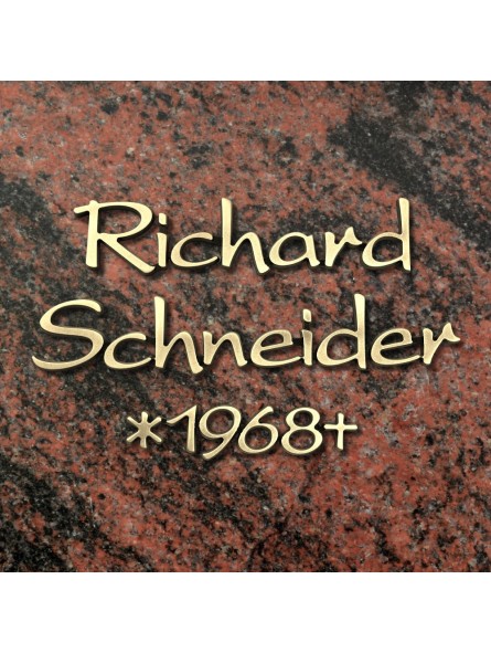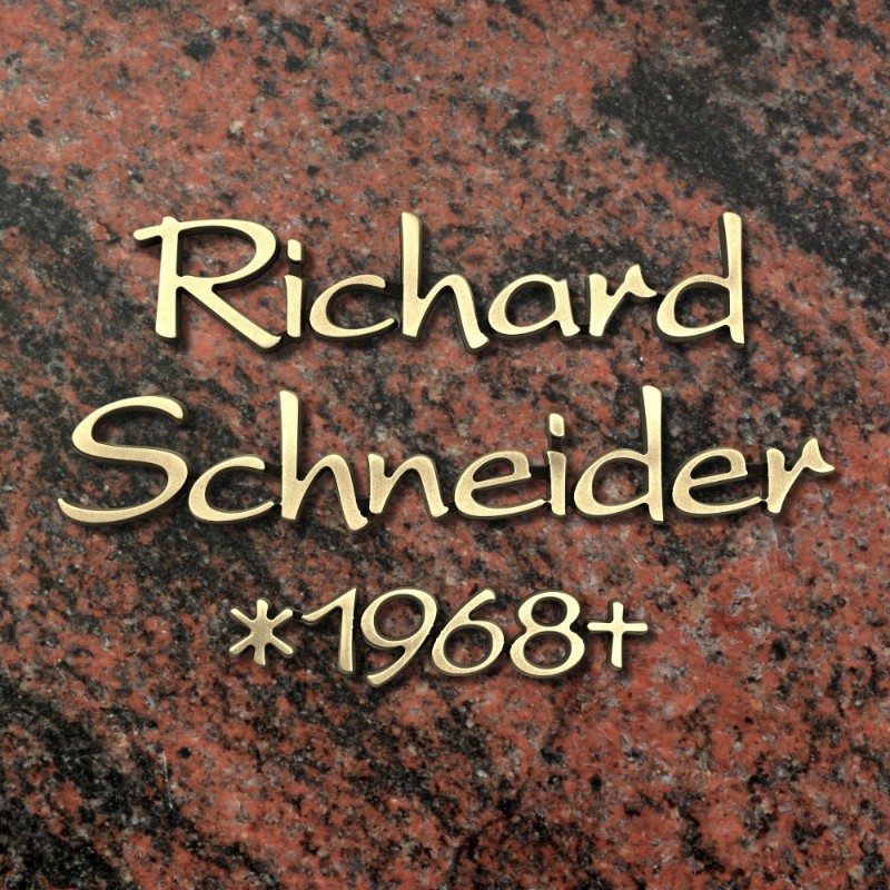 Hochwertige Metall-Schriftzeichen aus Bronzeguss für Ihre Inschrift. Diese Schriftzeichen sind absolut witterungsbeständig und durch eine "schwebende" Montage 3-4 mm über dem Grabstein sehr einfach zu reinigen.